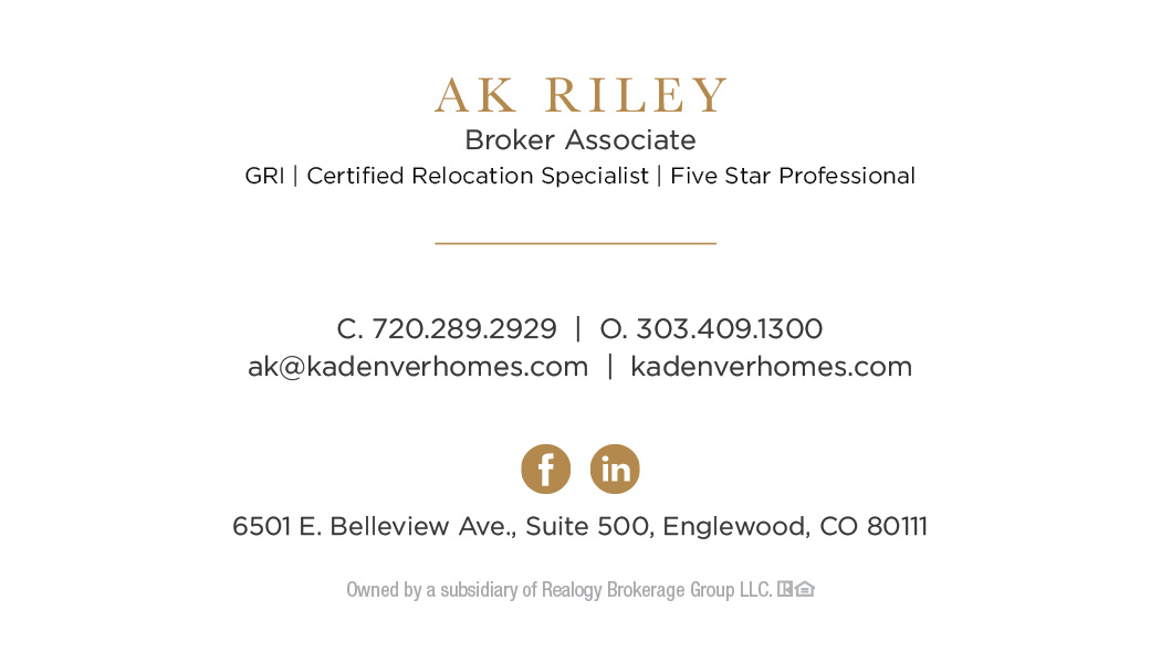 Top-producing and award-winning Coldwell Banker Realty agent AK Riley serves the Denver Metro area. AK believes education is the key to buying or selling a home, enabling her clients to make informed decisions. Her full-service approach, coupled with her marketing expertise, ensures a seamless real estate experience. AK truly loves being part of her clients’ real estate journey and considers it an honor they have placed their trust in her.
